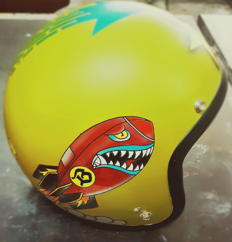 오픈페이스 헬멧에 레트로 느낌이 물씬나는 커스텀 로고 페인팅을 넣고 무광으로 마무리.