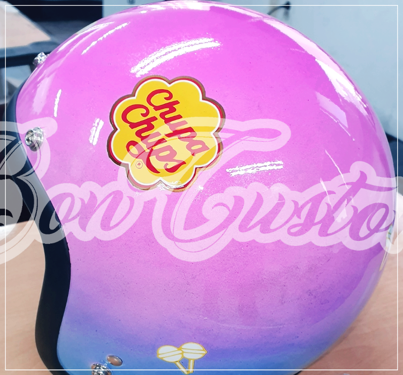 본 헬멧의 디자인은 추파춥스 로고를 모티브로 디자인을 하였습니다. 헬멧에는 크게 2개의 추파춥스 로고를 페인팅하였고 추파춥스 테마의 작은 로고가 도장되있으며 색상은 핑크와 보라색으로 구성되어 있으며 은은하게 마블 무늬가 베어 있습니다. 헬멧의 디자인은 팝적이고 밝은 느낌을 주며, 캔디를 좋아하는 사람들에게 매력적으로 어필할 수 있을거 같습니다. 전체적으로 추파춥스 커스텀 디자인 헬멧은 추파춥스의 브랜드 정체성을 잘 표현한것 같네요.
